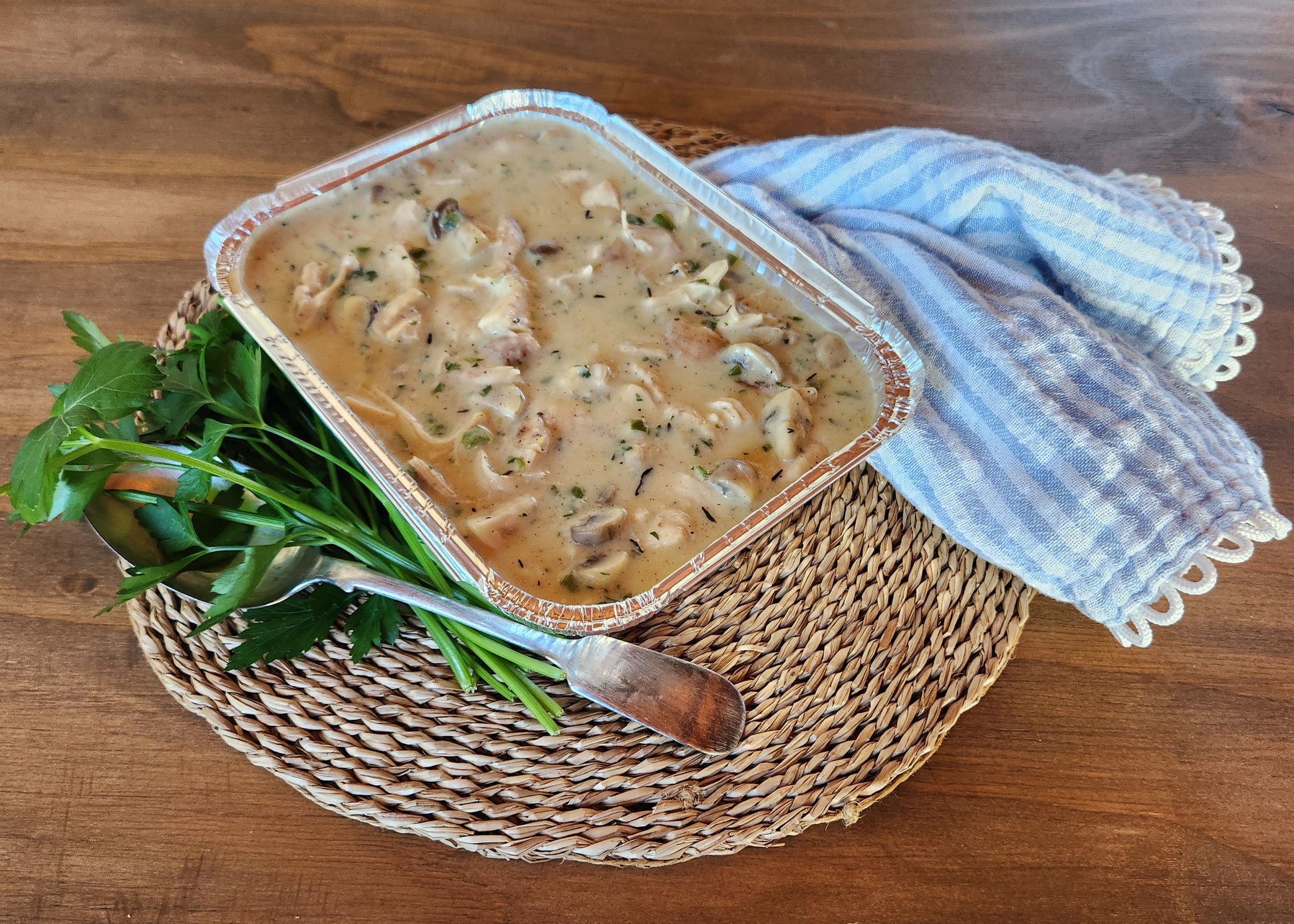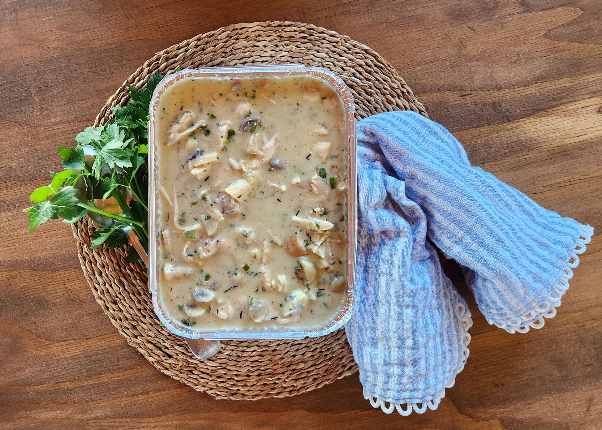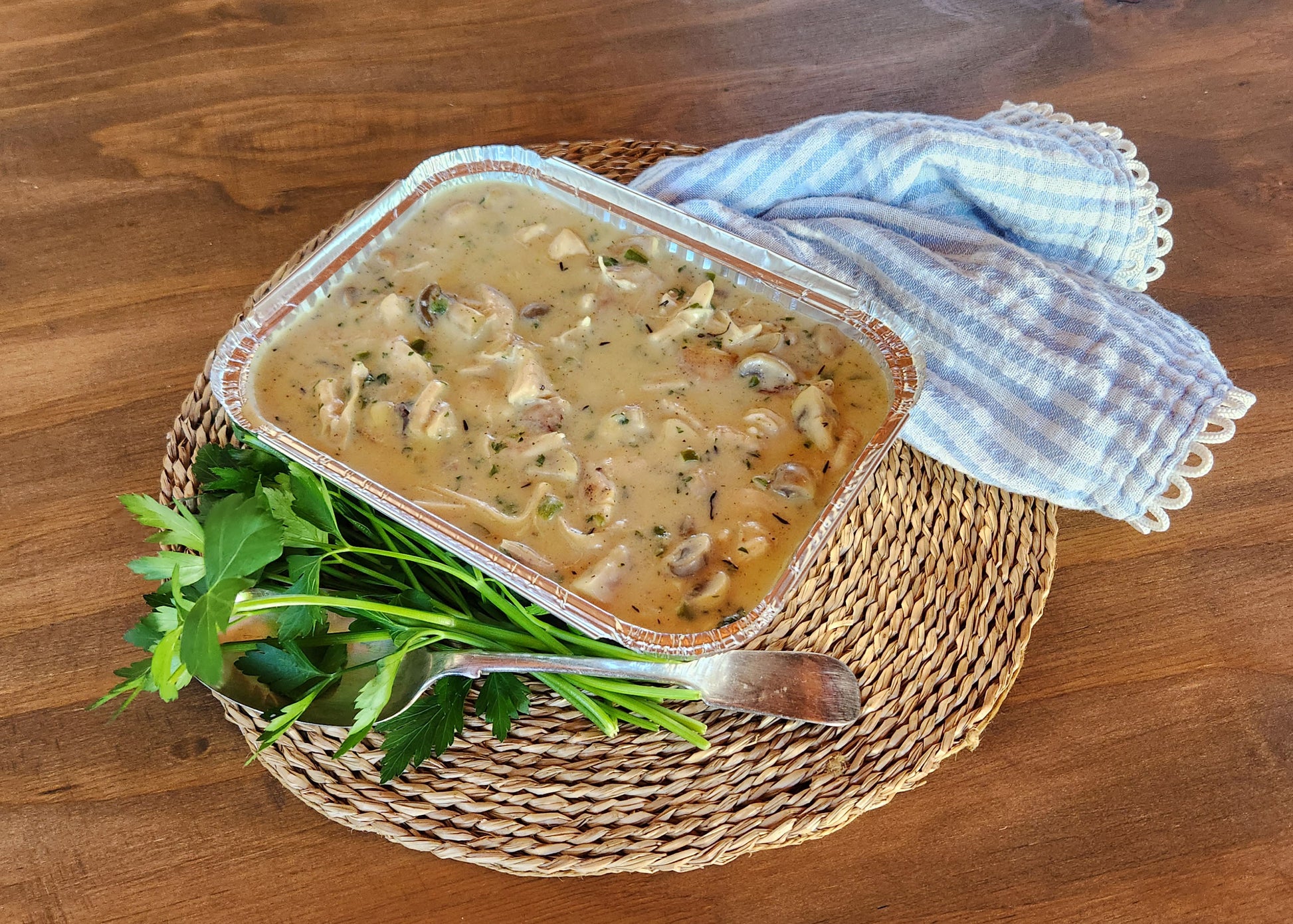 Creamy, comforting, and just the right amount of old-school indulgent — our Chicken à la King is a proper classic. Tender pieces of chicken cooked in a rich, silky sauce with mushrooms, peppers, and a touch of cream, finished with a sprinkle of herbs to bring it all together.